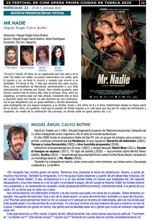 Tras la presentación del Festival Opera Prima Ciudad de Tudela se proyectará la nueva película del tudelano Miguel Ángel Calvo Buttini “Mr. Nadie”.