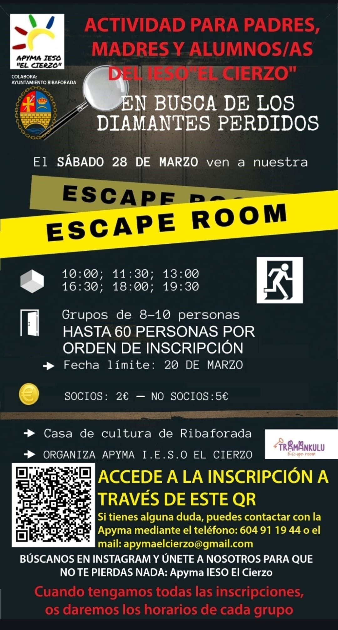 ¡Nos vamos de Escape Room en busca de los diamantes perdidos! El 28 de marzo, familias del IESO El Cierzo tenemos una cita llena de misterio y diversión. ¡Plazas limitadas, inscríbete antes del 20 de marzo!