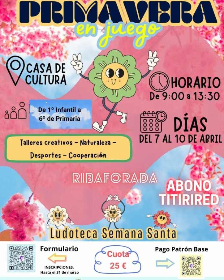 Inscripciones: hasta el 31 de marzo a través de este enlace: http://www.ribaforada.es/ludoteca-semana-santa-en-ribaforada-2026/?fbclid=IwY2xjawQvQBJleHRuA2FlbQIxMABicmlkETBZUElmeWxKS1FrMG5URHRPc3J0YwZhcHBfaWQQMjIyMDM5MTc4ODIwMDg5MgABHnpVmqFUOSSuwB7WPvHjZXEGa3RNRKf-ia0wFoZ52GRNzCFSv_zKAC5xl2tj_aem_iC8DNDgwvjZJOUXRGRV2Xg